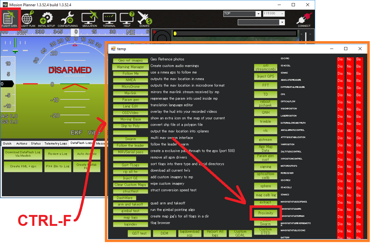 打开该窗口的方法是进入 "飞行数据 "屏幕,按下 Ctrl-F 并按下 "接近度 "按钮。如果 PRX_TYPE 参数设置为启用传感器,并且正在接收信息。