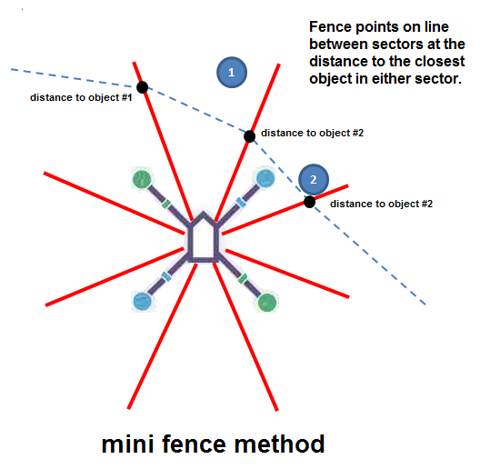 每个扇形宽 45 度,扇形 0 指向载具前方,扇形 1 指向载具右前方,等等。根据这些距离和角度,可以在载具周围建立一个栅栏(二维矢量阵列)。栅栏点落在扇形之间的直线上,并保持一定的距离。