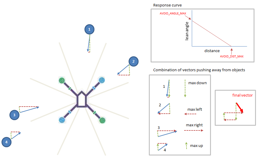 "这款" AP_Proximity 和 AC_Avoidance 库 也用于 AltHold 的避障。由于 AltHold 不依赖 GPS,因此不知道载具驶向障碍物的速度,因此使用了一种更简单的避障方法,即将到障碍物的距离转换为倾斜角。