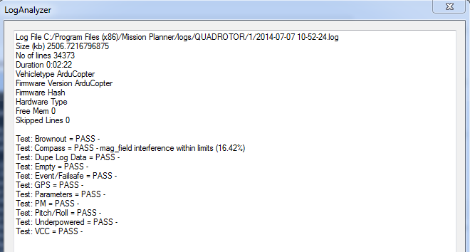 最简单的分析是生成一份基本的自动报告,突出显示常见问题区域。为此,请单击 "日志分析 "并选择已保存到 MissionPlanner/logs 目录中的日志。它们将被放在以载具类型命名的文件夹中,如 QUADCOPTER 或 ROVER。选中需要的日志后,就会生成类似下面的报告: