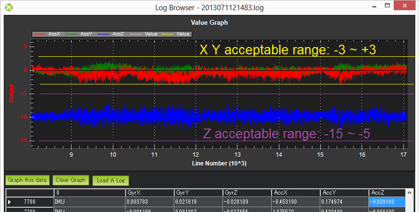 • 出现日志浏览器后,向下滚动直至找到任何 IMU 信息。单击该行的 AccX 并按下 将这些数据绘制成图表 左键。对 AccY 和 AccZ 列重复上述操作,生成如下图表。