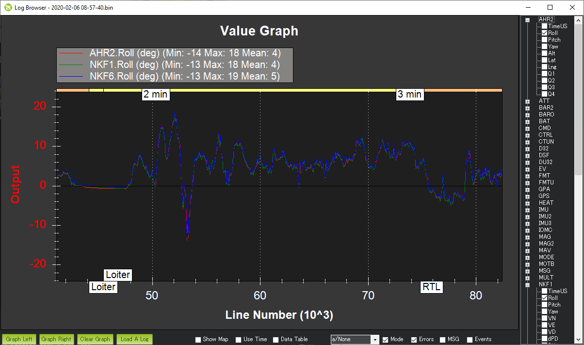 • 如果使用 EKF2,则比较 AHRS2.Roll、NKF1[0].Roll 和 NKF1[1].Roll;如果使用 EKF3,则比较 AHRS2.Roll、XKF1[0].Roll 和 XKF1[1].Roll。