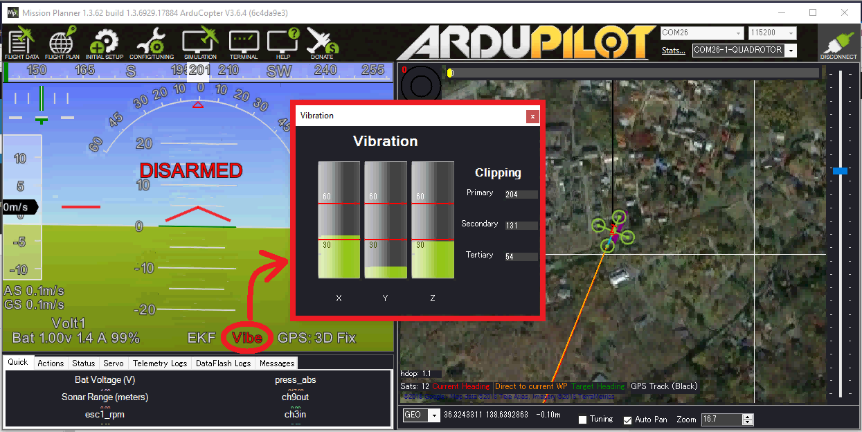 地面站可以实时显示振动和剪切情况。如果使用Mission Planner地面站,点击 HUD 上的 "Vibe"(振动),即可显示当前的振动级别。