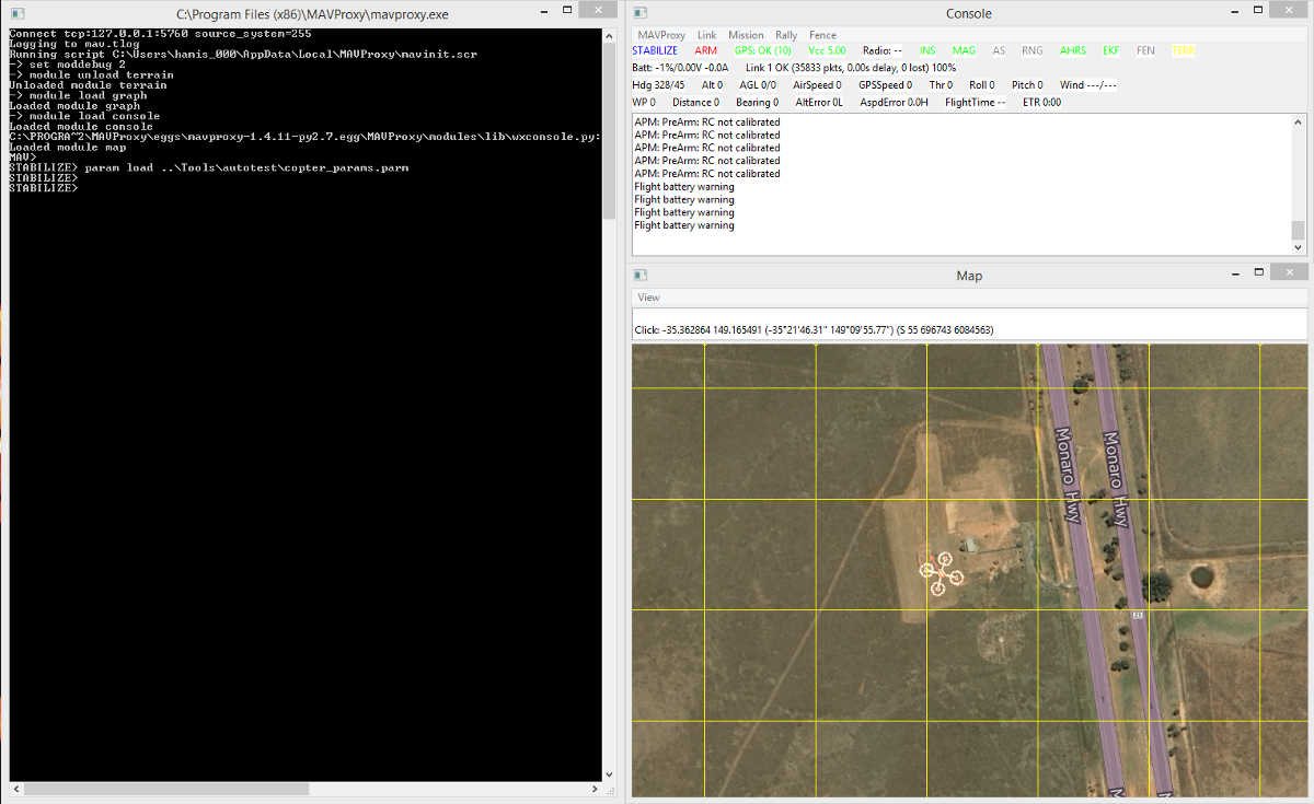 "这款" MAVProxy 命令提示符, 控制台 和 地图 应方便安排,以便同时观察状态和发送命令。