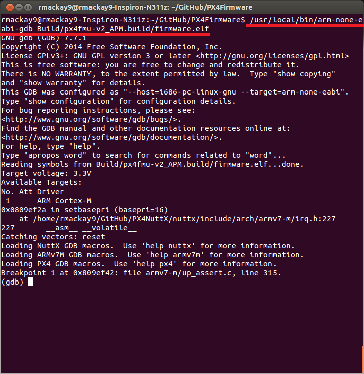 如果使用 Ubuntu,您的计算机上可能已经安装了 GDB,而且它也可以正常工作,不过我们建议您使用在此处下载的版本 https://firmware.ardupilot.org/Tools/STM32-tools