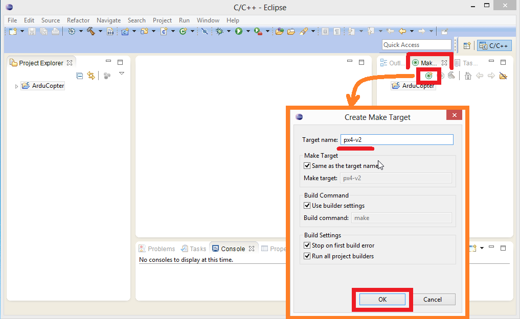 在右侧的制作窗口中,创建这些制作目标中的任意一个(可能的制作目标的完整列表请参见 px4_targets.mk):