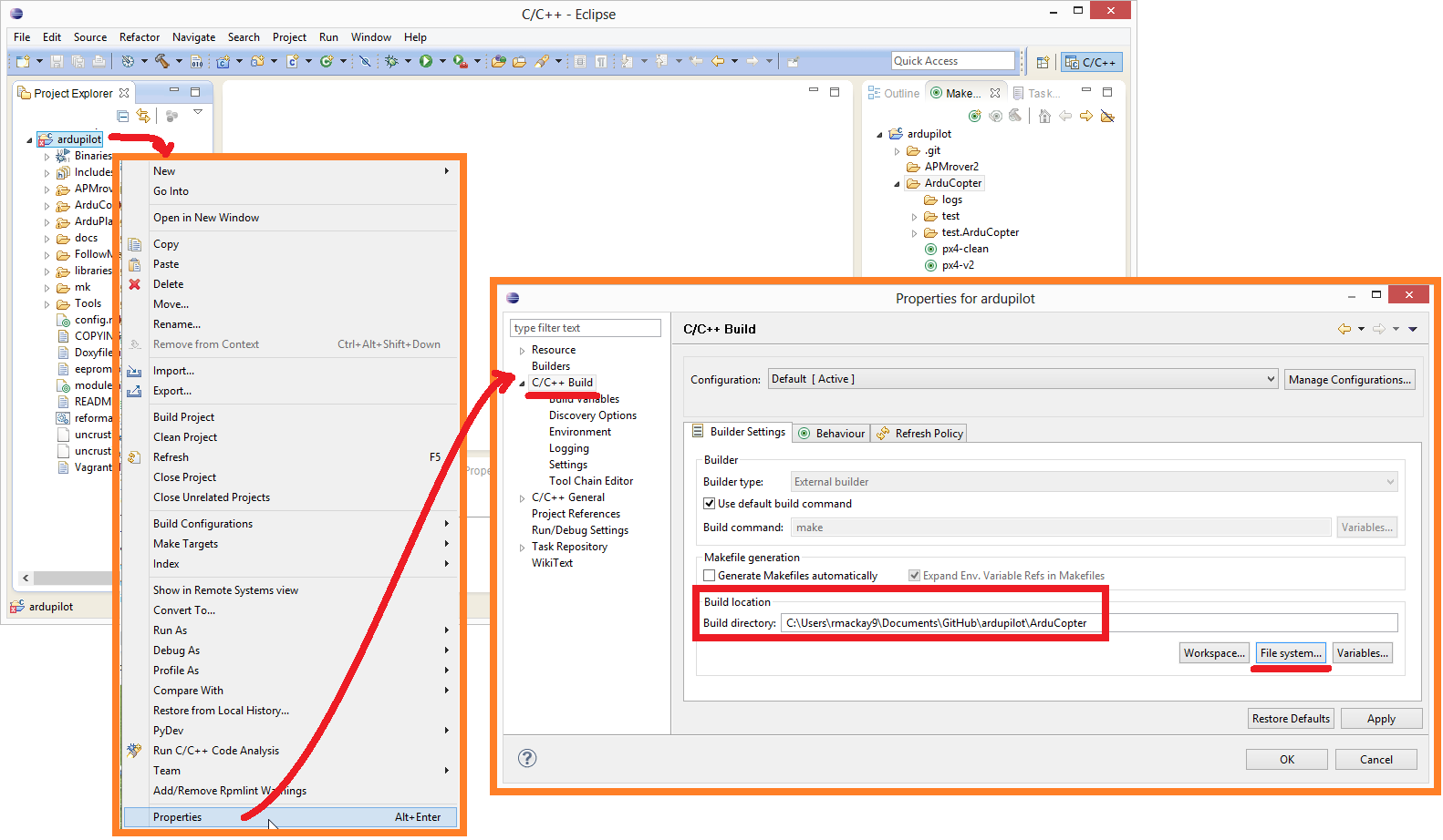 在 项目探索者 用鼠标右键单击 ardupilot 文件夹,然后选择 属性.然后在 C/C++ Build 下将 "Build location(构建位置)"设置为 Copter 或 Plane 目录,如下图所示。
