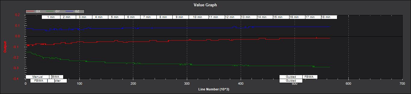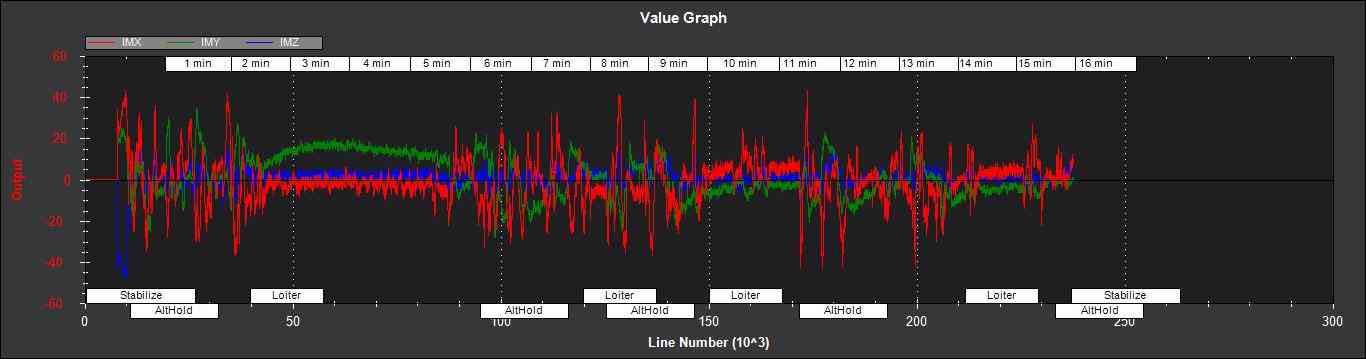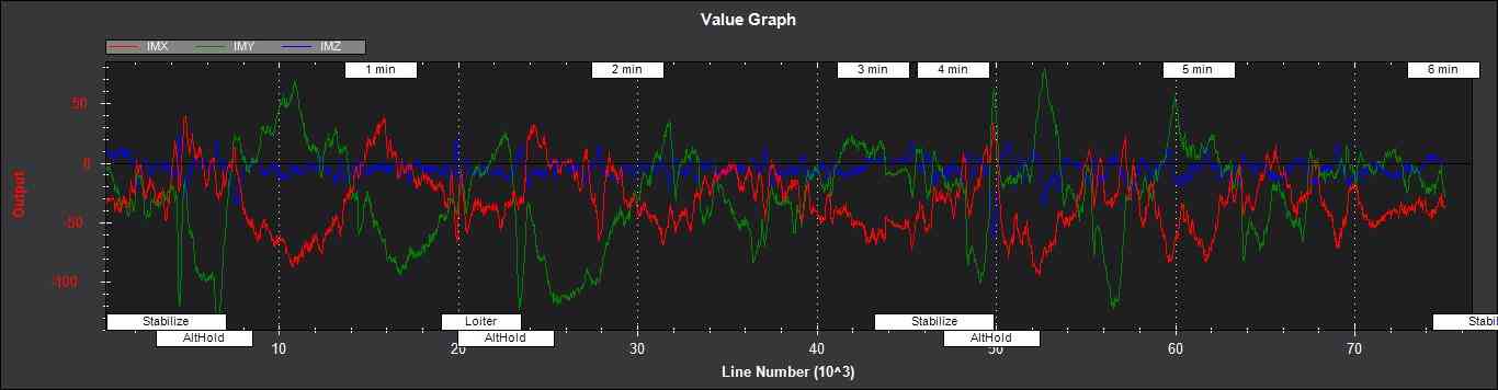 IMX,IMY,IMZ - 磁强计 X、Y、Z 测量值的变化。如下图所示,在机动过程中,这些误差应以零为中心,且不得超过 +- 50: