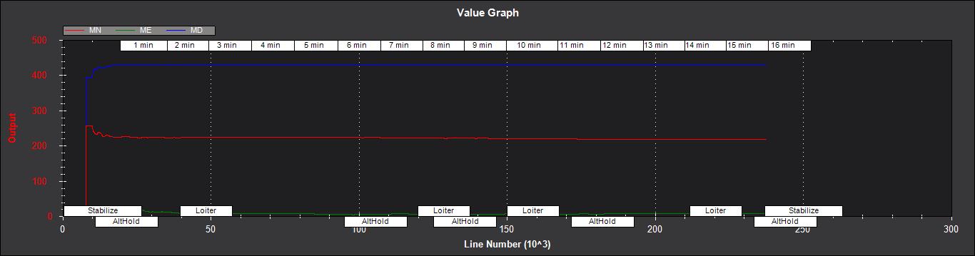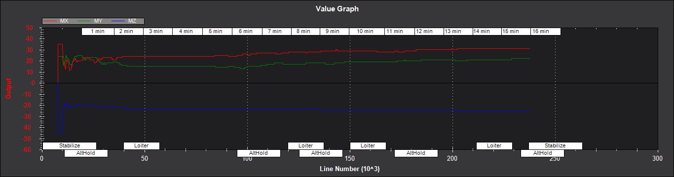 MX,MY,MZ - X、Y、Z 机身磁场偏置(传感器单位)。如果您正在快速飞行,或处于低速状态,而 EKF_MAG_CAL 启用后,随着滤波器对地球磁场的 "学习",这些值将在飞行过程中缓慢变化。它们与罗盘偏移的含义相同,但符号相反(例如下图中 MX 稳定在 +35 的值,表明在飞行过程中,在地球磁场的作用下,MX 的磁场偏移会减小)。 COMPASS_OFS_X 应使用 -35 值。