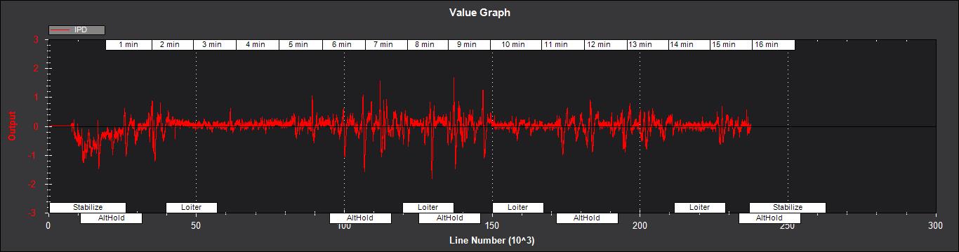 IPD - 气压计高度测量值的变化(米)。尽管由于 IMU 误差、传感器滞后以及气流变化对气压计读数的影响,在进行高度骤变或机动时,2 米左右的瞬态变化很常见,但如下例所示,这些变化应该很小,并以零为中心。