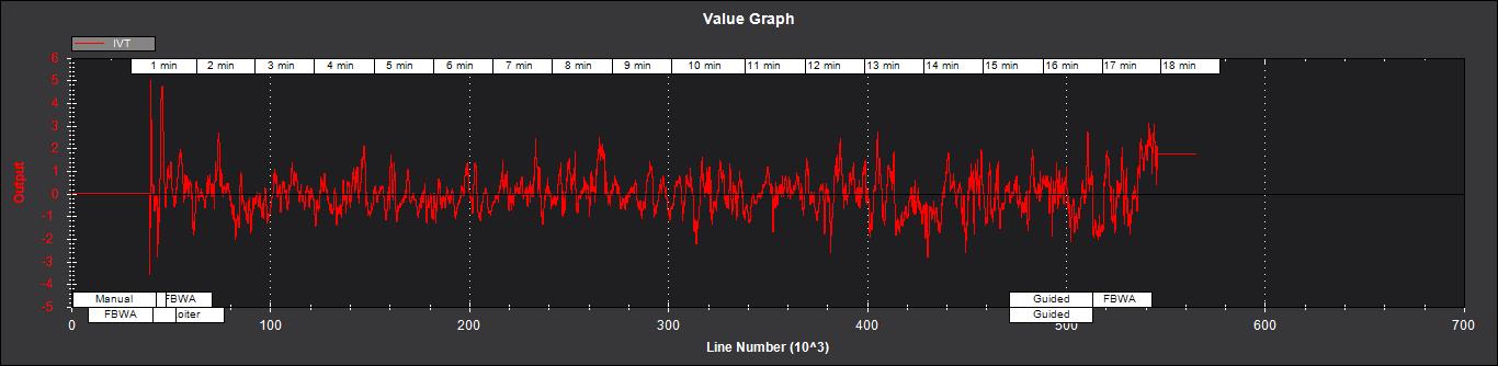 IVT - 真实空速测量值的创新值(米/秒)。如果未安装或未使用空速传感器(如在地面上),该值将为零。如果空速传感器校准正确,则其中心应为零,但噪声水平会因飞行条件的阵风程度而异。以下是在低湍流、中等风速(约 7 米/秒)条件下使用校准良好的空速传感器进行飞行的示例:
