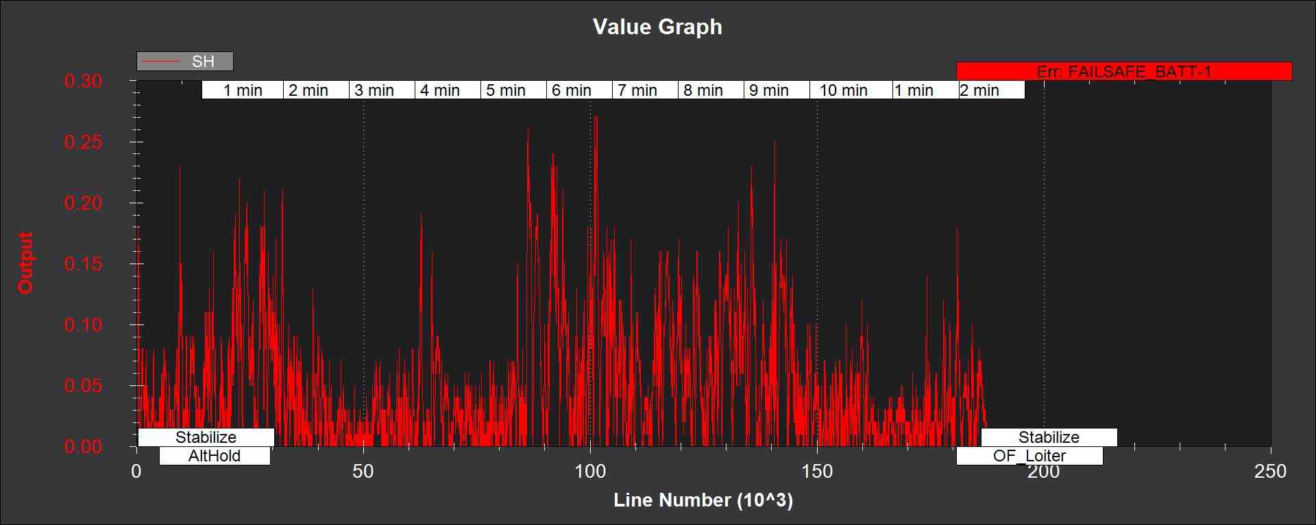 SH - 气压计高度不一致性与气压计限值的比率 EKF_HGT_GATE 参数。如果这条线超过 1,则表明过滤器停止使用该飞行时段的气压数据。如果传感器数据良好,这种情况应该不会发生。下图显示 SH 取自四旋翼飞行器在最高 16 米/秒的空速下使用默认参数飞行时的数据。如果这条线过高,超过 1,则应增加``EKF_HGT_GATE``参数。导致该值偏高的因素包括经过(飞行)控制器的气流影响气压计读数,以及传感器漂移或混叠导致的加速度计误差。