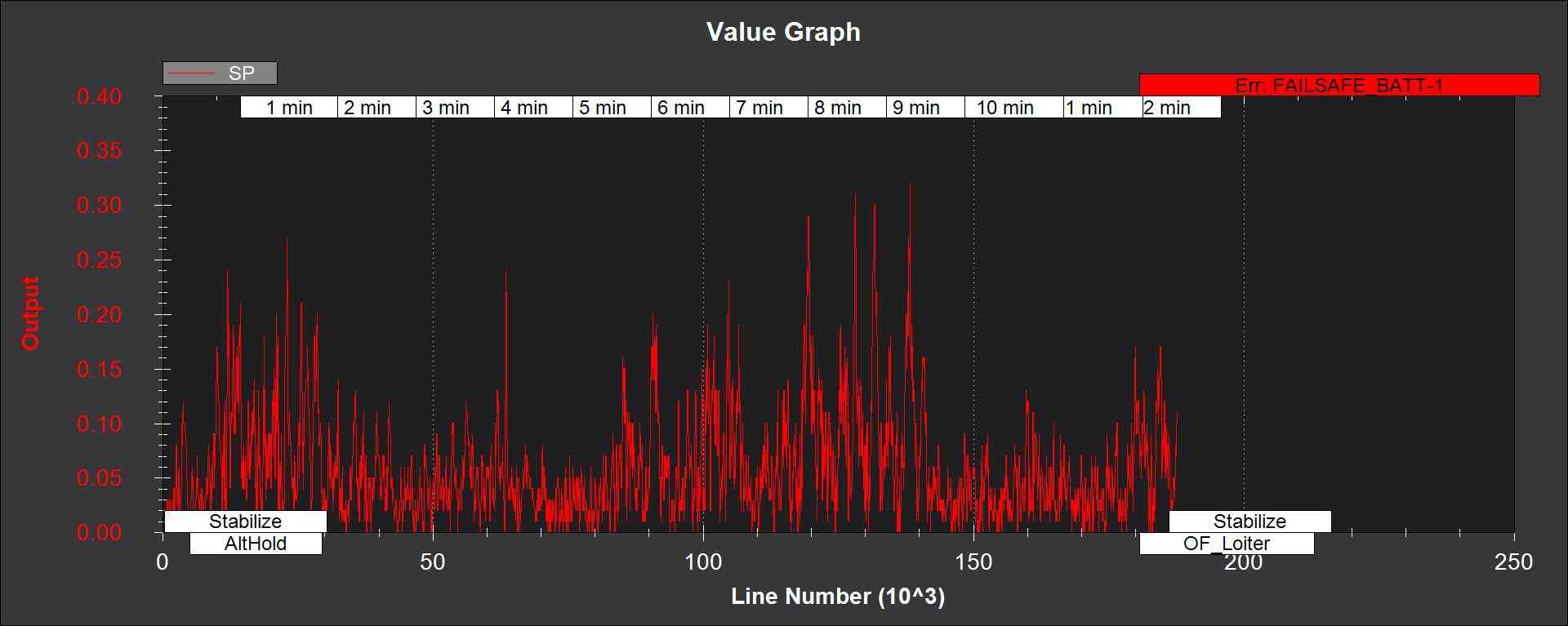 SP - 全球定位系统总位置不一致性与 EKF_POS_GATE 参数。对于 GPS 数据良好的飞行,该值偶尔会超过 1/2,但绝对不会超过 1。在传感器数据良好的情况下,这种情况绝对不会发生。下图显示 SP 取自四旋翼飞行器在良好 GPS 条件下使用 9 至 10 颗卫星飞行时的数据,使用的是默认参数。如果这条线过高,在 GPS 状态良好的情况下超过 1,则说明 EKF_POS_GATE 参数应增加。