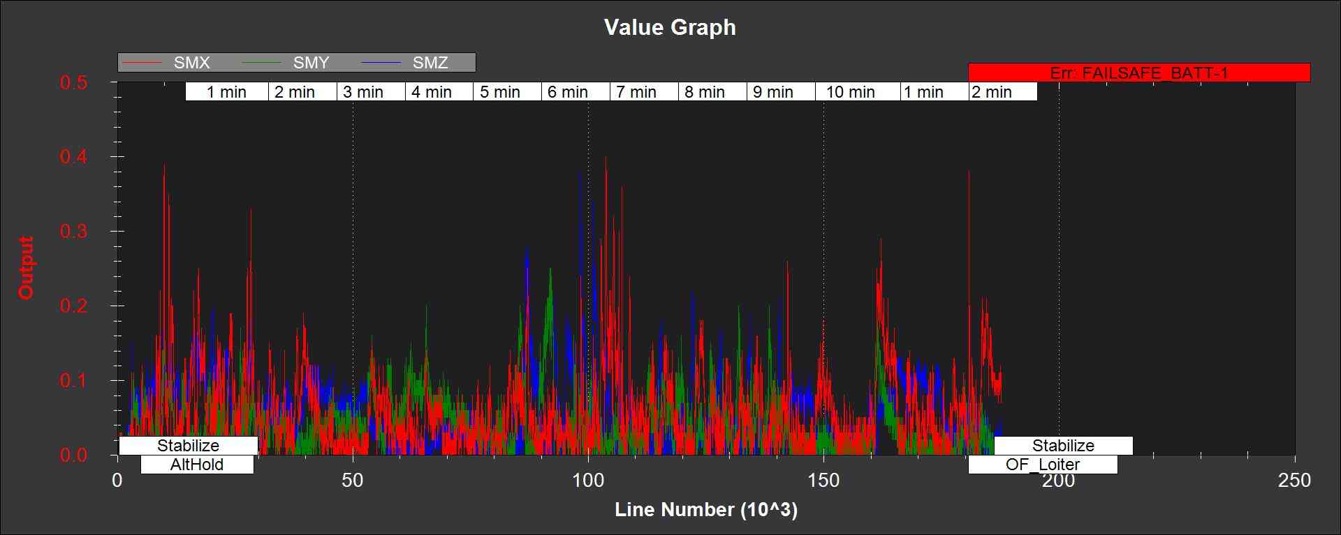 SMX,SMY,SMZ - 磁强计 X、Y 和 Z 测量不一致性与限值的比率 EKF_MAG_GATE 参数。如果这条线超过 1,则表明滤波器停止使用该飞行时段的磁强计数据。在传感器数据良好的情况下,这种情况不应该发生。下图显示了使用默认参数从四旋翼飞行器上获取的 SMX、SMY 和 SMZ 数据。如果这条线过高且经常超过 1,则表明罗盘校准或安装存在问题。建议在增大罗盘误差之前,首先调查罗盘误差的原因。 EKF_MAG_GATE 参数。