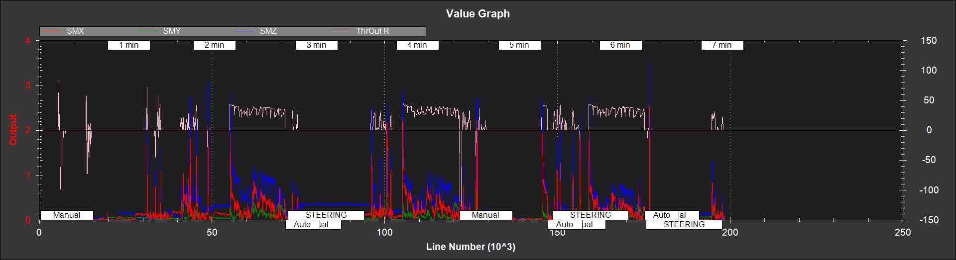 下图显示 SMX, SMY 和 SMZ 从漫游日志中提取,节流需求 ThrOutR 也绘制出来了。