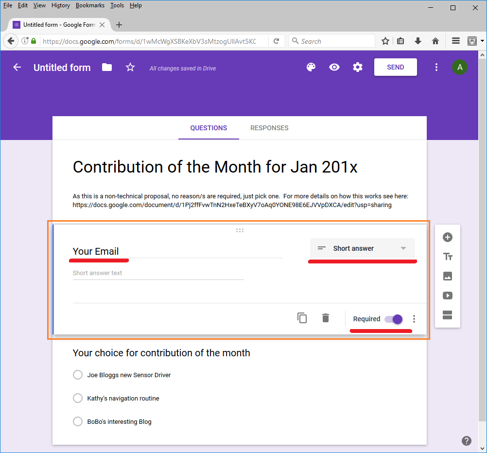 第一个问题的标题应为 "您的电子邮件",类型为 "简答 "和 "必填"。