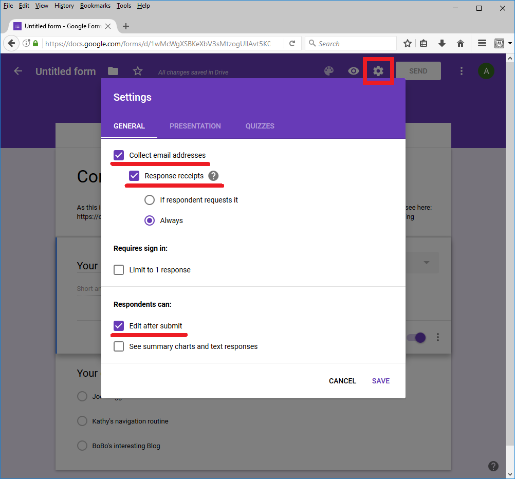 要允许用户修改回复,请选择齿轮图标并选中 "提交后编辑",然后按保存。