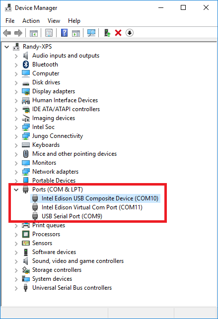 在 Windows 机器上,英特尔 Edison 应显示在设备管理器中,如下图所示