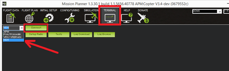 转到终端屏幕,将最左边的下拉菜单设置为 "NSH",然后按连接。