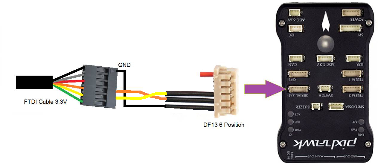 要在 Copter 或 Plane 运行时使用 NSH,可以使用串口 4/5 进行连接。为此,您需要一个 FTDI 3.3V 电缆 然后修改一个 DF13 6 位置电缆 以便与 FTDI 电缆连接。