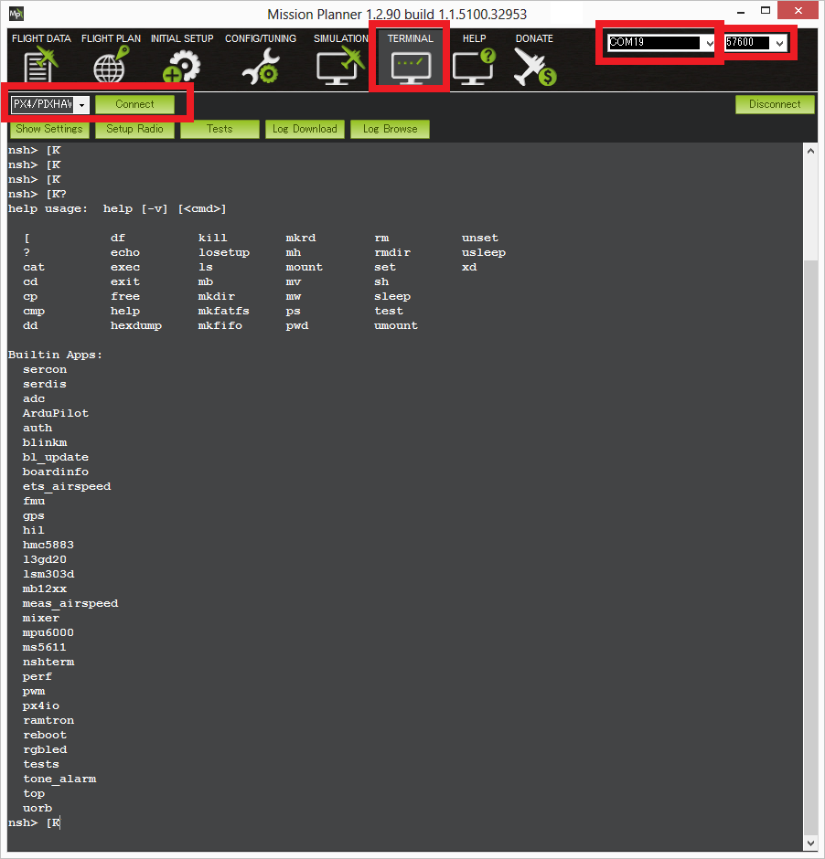 然后,您就可以将 FTDI 电缆插入计算机,并与任何串行程序(包括Mission Planner地面站的终端屏幕)连接。确保选择 FTDI 电缆的 COM 端口,并将波特率设为 57600。出现 "nsh> "提示时需要按回车键。