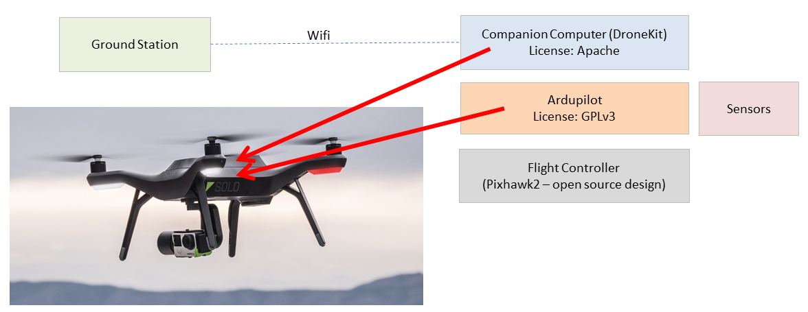 ArduPilot 是开放源代码(GPLv3),但您可以使用配套计算机运行封闭源代码,以便于将 ArduPilot 集成到您的公司系统中,或添加更高级别的功能,使自己与竞争对手区别开来。您可以在免费的低级飞行代码的可靠性基础上,投资于更高级别的功能。我们相信,ArduPilot 与领先的封闭式系统一样可靠,而且您无需依赖特定的制造商。下面是一家制造商如何做到这一点的图片。