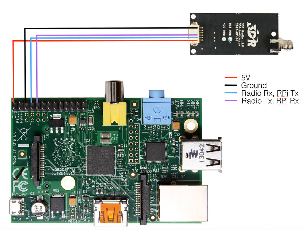 此处的说明介绍了如何通过串行端口使用 3DR 无线电连接 RPi。通过 USB 端口连接无线电要简单得多。连接