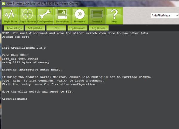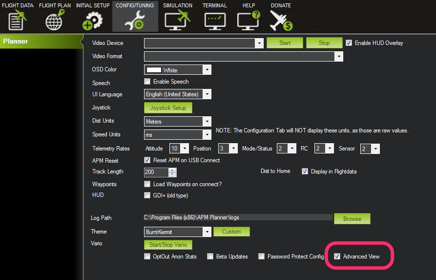 注意: 打开此菜单项后,与 APM 或 PX4 的连接不会改变。如果已连接,则将保持连接。这样做是为了防止在执行任务或载具上膛运行时失去控制。您必须单击 "连接 APM "或 "连接 PX4 "按钮才能使用此屏幕中的功能。
