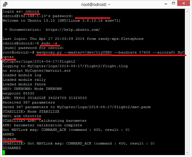 在 odroid shell 中键入 "sudo adduser odroid dialout"--这样 odroid 账户就能访问串行(pixhawk)端口。
