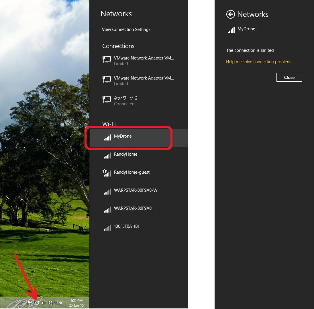 要从 Windows 8.1 机器连接,请单击时钟附近的网络图标,然后单击 "MyDrone"、"连接",30 秒左右后就会连接,并显示 "连接受限 "信息,因为 Odroid 可能无法访问互联网(没关系)。