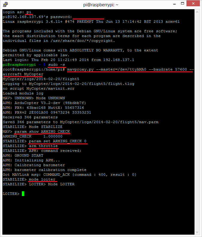 要测试 RPi 和飞行控制器是否能相互通信,首先要确保 RPi 和飞行控制器都有电源,然后在 RPi 类型的控制台中进行测试: