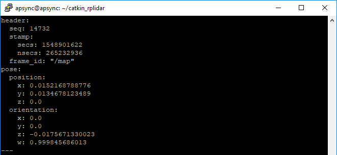 要确认 ROS 端工作正常,请键入以下命令,制图师提供的位置估计实时更新信息就会显示出来