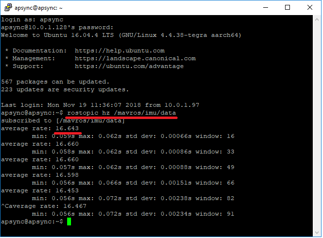 运行以下命令,在运行 ROS 的配套计算机上查看加速度计和陀螺仪数据及更新率