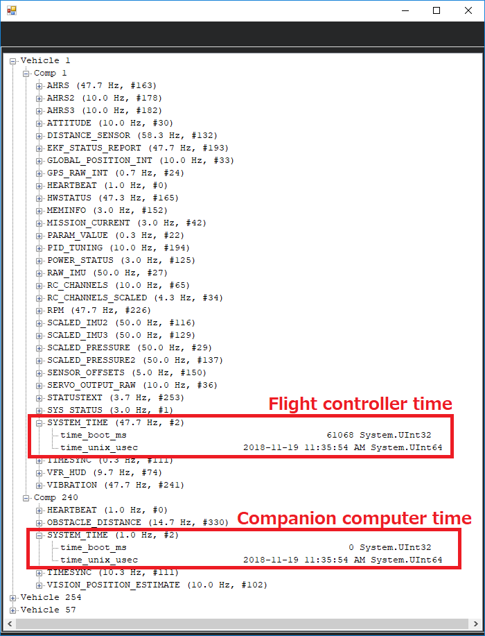 可以使用 MAVLink 检查器(可使用 QGC 或 MissionPlanner)检查系统时间是否同步。如果使用 Mission Planner,请按 Ctrl-F,然后按 "MAVLink Inspector "按钮。