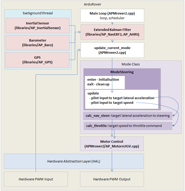 接近底部 mode_acro.cpp 您将看到这些目标是如何发送到转向控制器和油门控制器的。转向和油门控制器接口可在 APM_Control/AR_AttitudeControl 库.父模式类还提供了一些导航方法,这些方法在 mode.h (搜索 "导航方法")。