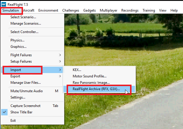 选择模拟(Evolution 中的 "My RealFlight")、导入、RealFlight 存档(RFX、G3X)并选择上面下载的 QuadcopterX 文件。此时将显示"...已成功导入 "信息