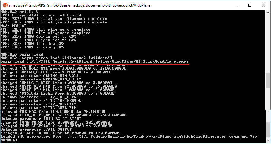 如果在启动 SITL 时使用"-add-param-file=*pathtofile*"(....ie: sim_vehicle.py -f flightaxis:x.x.x.x -map - -console -add-param-file=*pathtofile* -w)添加参数文件,则可以避免上述问题。这将把参数文件添加为默认设置,然后清除模拟目录中可能存在的任何先前的参数更改。