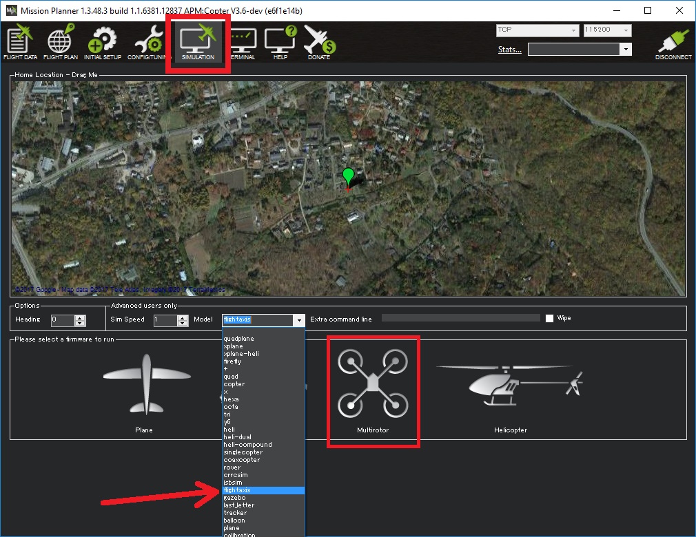 为相应的飞行器启动Mission Planner地面站飞行器模拟,勾选 "不下载 "复选框,并如上所述选择飞行轴。