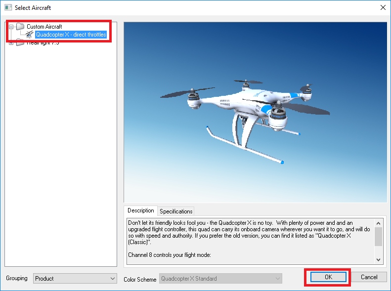 选择飞机(在 Evolution 的 "飞行 "下),选择飞机(打开 Realflight 的 "自定义飞机 "部分),然后选择 "QuadcopterX-flightaxis"。在当前状态下,遥控输入直接来自摇杆,因此无法飞行。