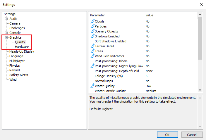 如果使用 RealFlight8/9,根据您的显卡/处理器和 CPU 性能,您可能需要降低图形处理能力以提高性能。您需要运行 200Hz 或更高的刷新率,以获得最佳模拟器性能。RealFlight Evolution 已大大提高了性能,因此可能不需要降低这些性能: