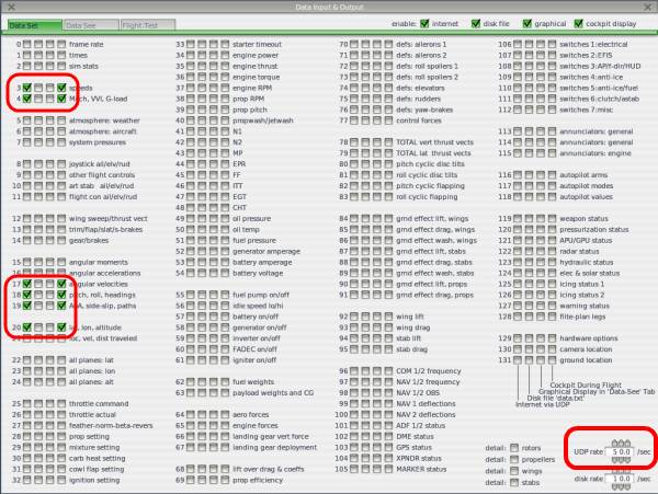 您还需要从 X-Plane 输出数据。点击 设置那么 数据输入 & 输出.从下面的截图中至少复制一个设置。然后,ArduPilot 将向 X-Plane 发送命令,启用其运行所需的所有输出数据字段。