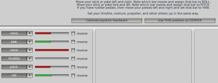 操纵杆设置请转至设置 -> 操纵杆和设备。您应设置滚动、前平移/俯仰、偏航和油门控制。请注意,X-Plane 的油门设置与众不同,全油门时控制杆完全向左,零油门时则完全向右。