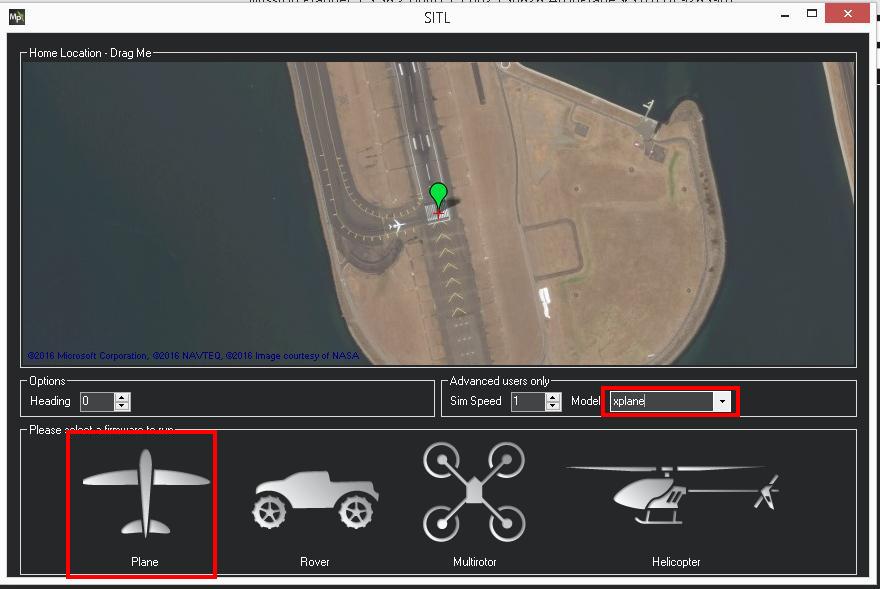 在模拟屏幕中,您需要选择 "xplane "模型,然后选择 "Plane"(飞机)。目前,我们只支持在 X-Plane 中使用 SITL 的固定翼飞机和旋翼飞行器。将来我们可能会支持其他类型的飞机。有关旋翼飞行器飞行的更多信息,请参阅下文。