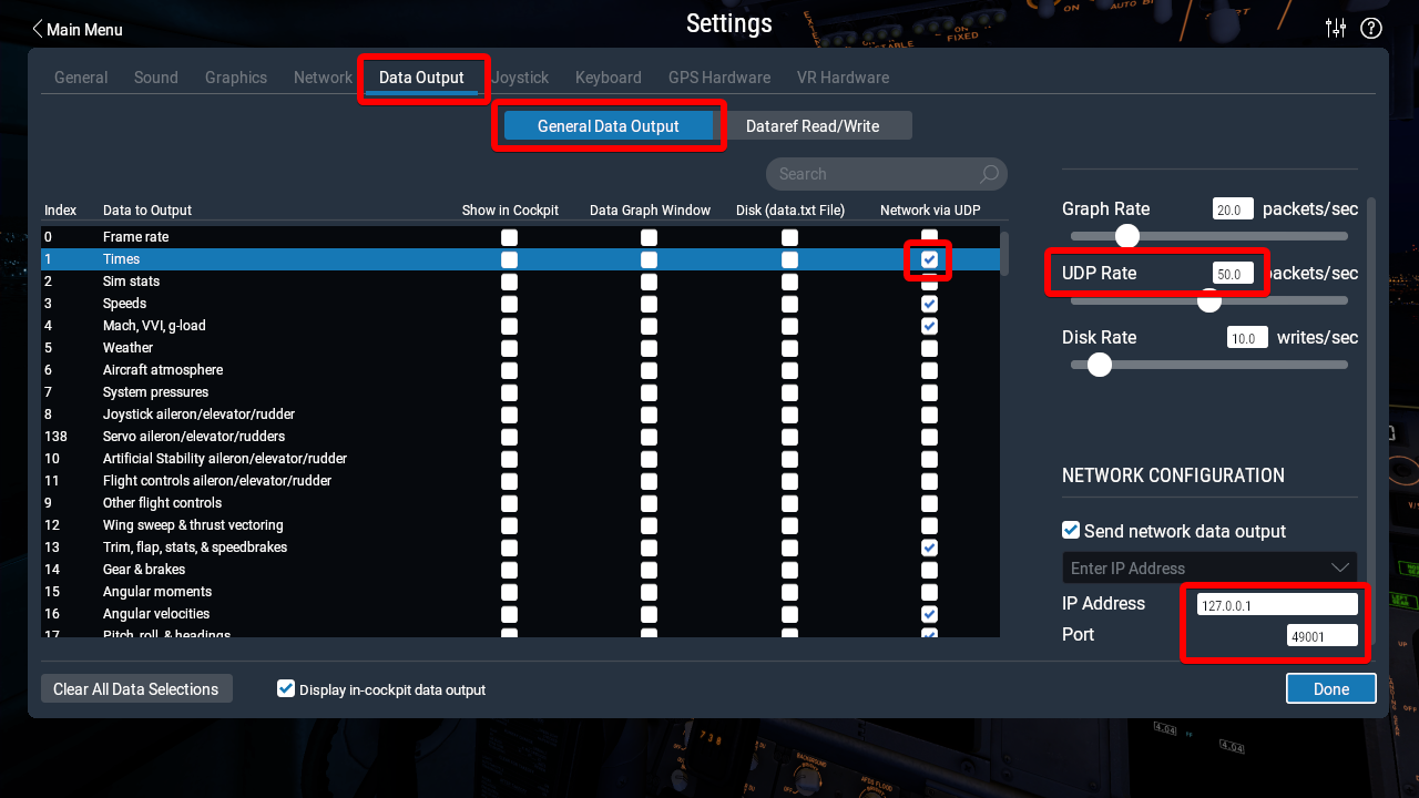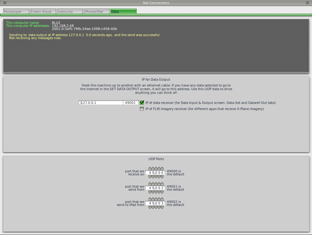 进入 X-Plane 的 "设置 -> 网络连接 "菜单,然后进入 "数据 "选项卡。设置正确的 IP 地址,并将目标端口号设置为 49001。确保接收端口为 49000(默认值)。如果使用环回(即 127.0.0.1),还需确保 "发送端口 "不是 49001。在下面的示例中使用的是 49002。