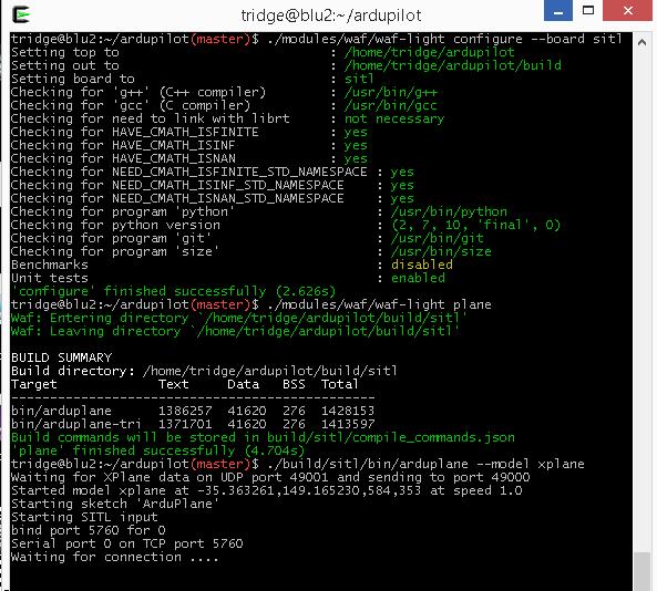 $ modules/waf/waf-light configure --board sitl $ modules/waf/waf-light plane $ build/sitl/bin/arduplane --model xplane