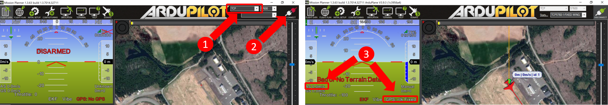 让Mission Planner地面站与 Silent Wings 和 ArduPlane SITL 建立连接。 为此,请在Mission Planner地面站右上角选择 TCP,点击 连接在弹出的窗口中输入运行 Silent Wings 的 IP 地址(如果在同一台机器上,则为 127.0.0.1),并在下一个窗口中输入 5760 作为端口号。等到 连接 Mavlink 窗口会消失,所有参数都会复制过来,Mission Planner地面站 HUD 中的所有校准信息也会消失。您应该看到Mission Planner地面站的 HUD 报告说 GPS 已锁定,空速传感器读取的值约为 0。