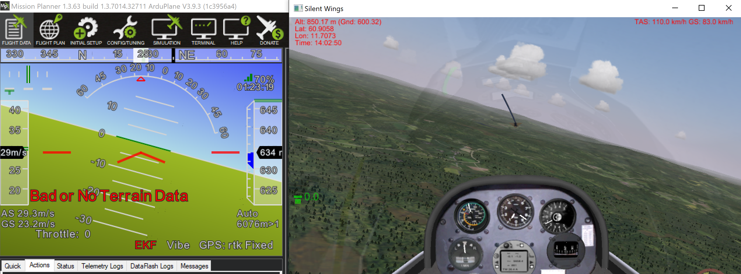开始飞行 现在,一切准备就绪,可以开始飞行了。在 Silent Wings 窗口中,点击 "p "键取消模拟。您应该会看到Mission Planner地面站 HUD 中的空速、高度和 AHRS 读数与 Silent Wings 右上角和左上角的读数非常接近。要让 Silent Wings 的帆船跟随载入的任务飞行,请将飞行模式切换为 载具 在Mission Planner地面站中。