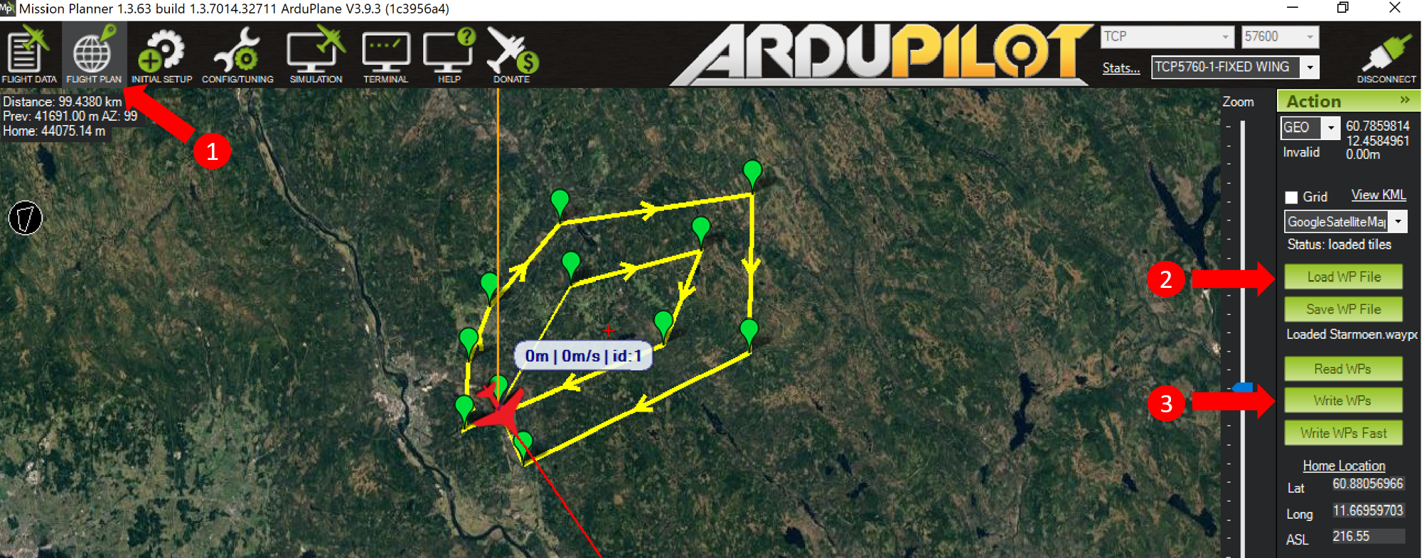 如果需要,可在Mission Planner地面站中加载任务。 为此,请访问Mission Planner地面站的 飞行计划 选项卡,点击 加载 WP 文件 右侧,找到任务文件,然后单击 编写 WP.我们为 挪威斯塔莫恩附近的试验任务.