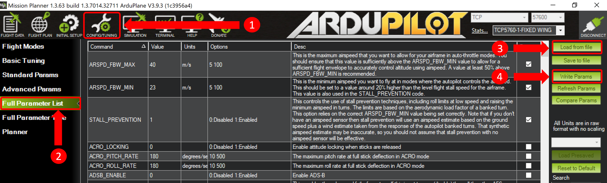 通过Mission Planner地面站将所选静音翼帆板的参数文件载入 ArduPlane。 (只有第一次在 Silent Wings 中飞行特定的帆船模型时才需要执行此步骤)。 为此,请访问Mission Planner地面站的 配置/飞行稳定调整 选项卡,选择 完整参数列表 点击左侧的 从文件加载 右侧,找到参数文件,然后单击 写参数 右侧。之后,在 Cygwin64 终端中终止 ArduPlane SITL,关闭 Mission Planner,并重复步骤 2 和 4。