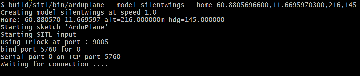 此时,SITL 应在等待与地面控制站(Mission Planner地面站)的连接:
